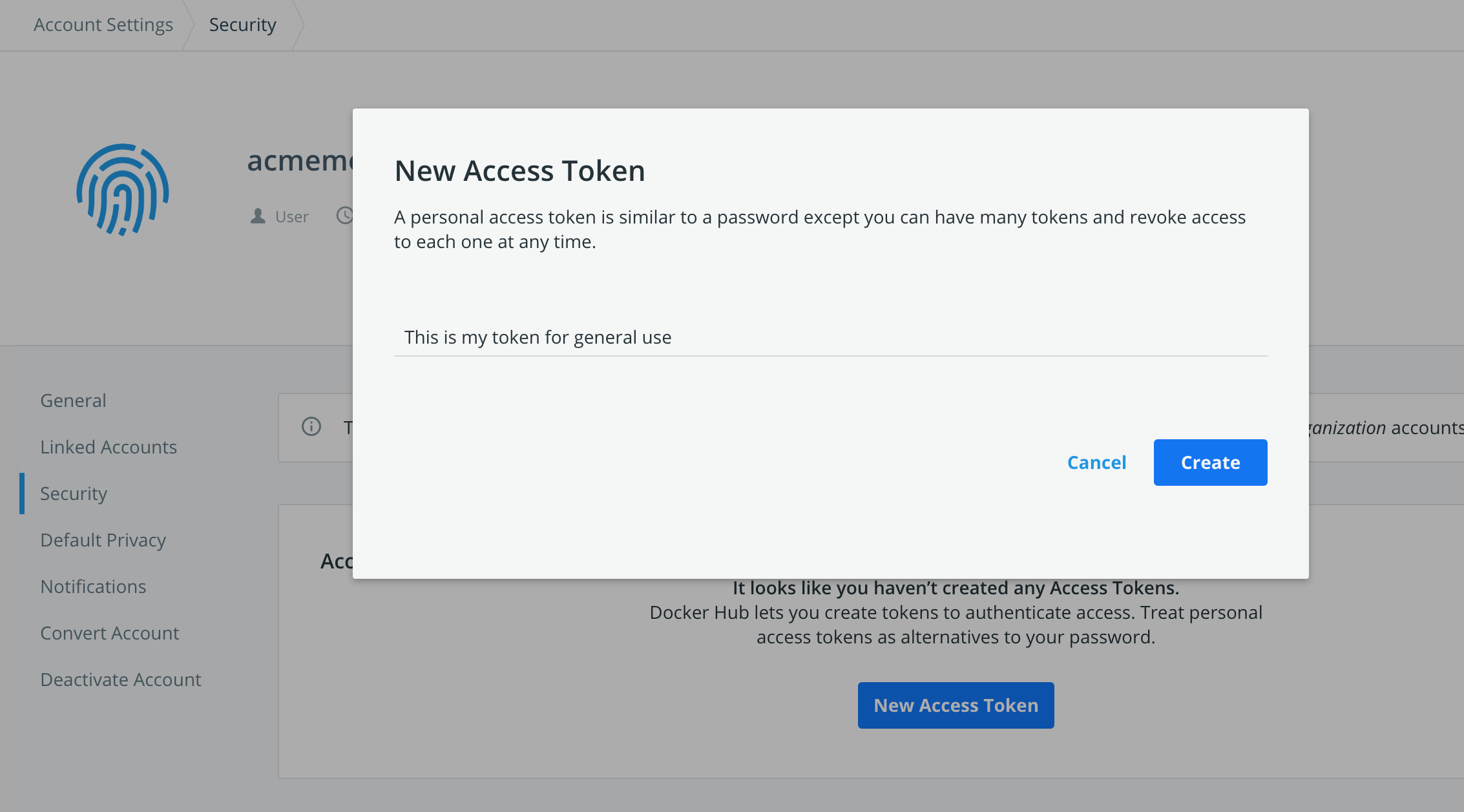 Note: If you have two-factor authentication (2FA) enabled on your account, you must create at least one personal access token. Otherwise, you will be unable to log in to your account from the Docker CLI.